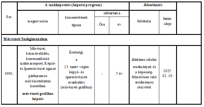 A szakgimnáziumi oktatás keretében tanulóink érettségi vizsgát tesznek, szakmai tárgyak által a rajzi készség fejlesztésével párhuzamosan lehetőséget biztosítunk a hagyományos grafikai technikák, valamint a számítógépes grafikai programok biztos kezelésének elsajátításához. A diákok felkészülését a szakmai tantárgyak mellett számos kulturális eseményen való részvétellel is színesítjük, ugyanis iskolánk fontosnak tartja, hogy diákjai széles látókörrel rendelkezzenek a hazai művészeti élettel kapcsolatban is.